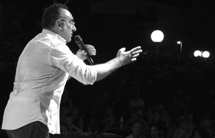 È un mix esplosivo di parole, musica e garbata ironia. Esilerante lettore della coppia moderna, della crisi generazionale, del rapporto genitori figli fotografando con una graffiante satira di costume i vizi e le virtù di ognuno di noi.